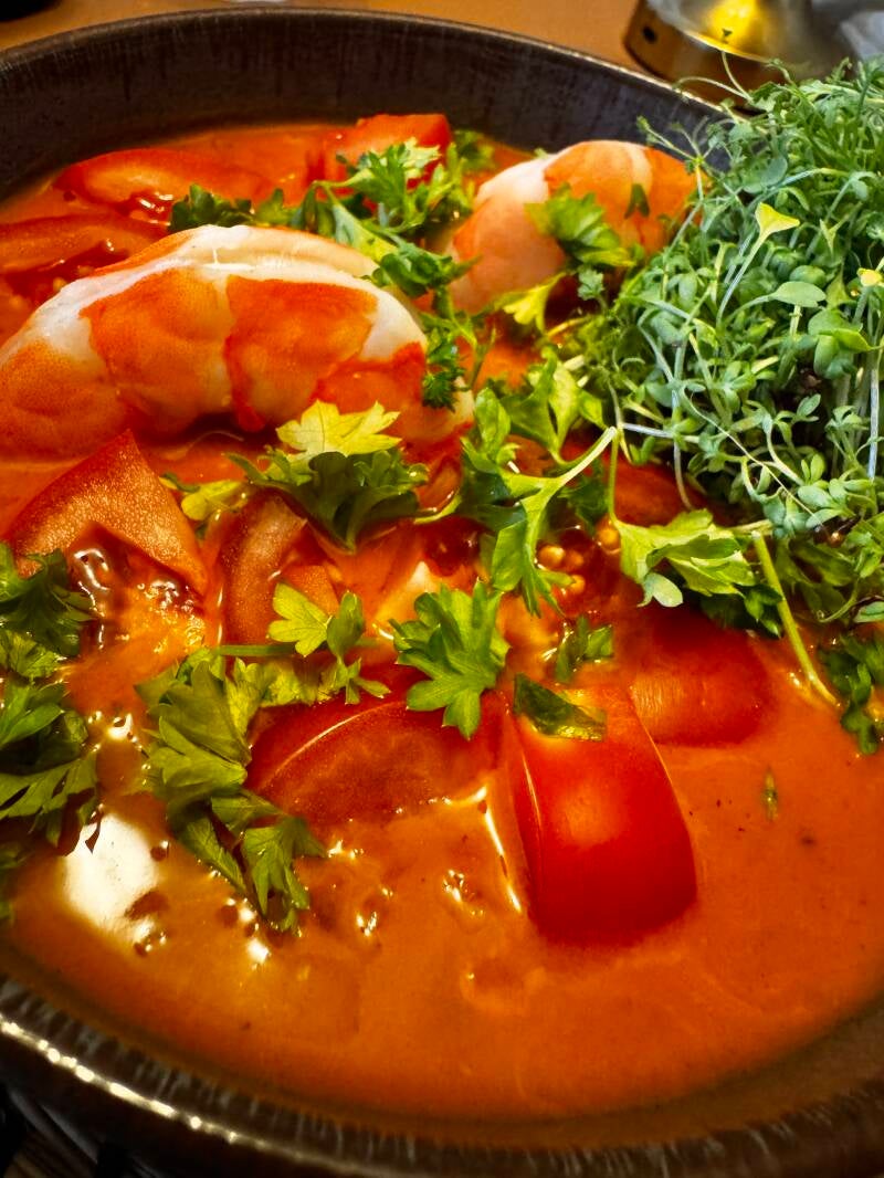 Doe de scampi terug in de pan samen met de tomatenblokjes. Laat nog 2–3 minuten doorwarmen op laag vuur, zodat de smaken zich goed mengen.