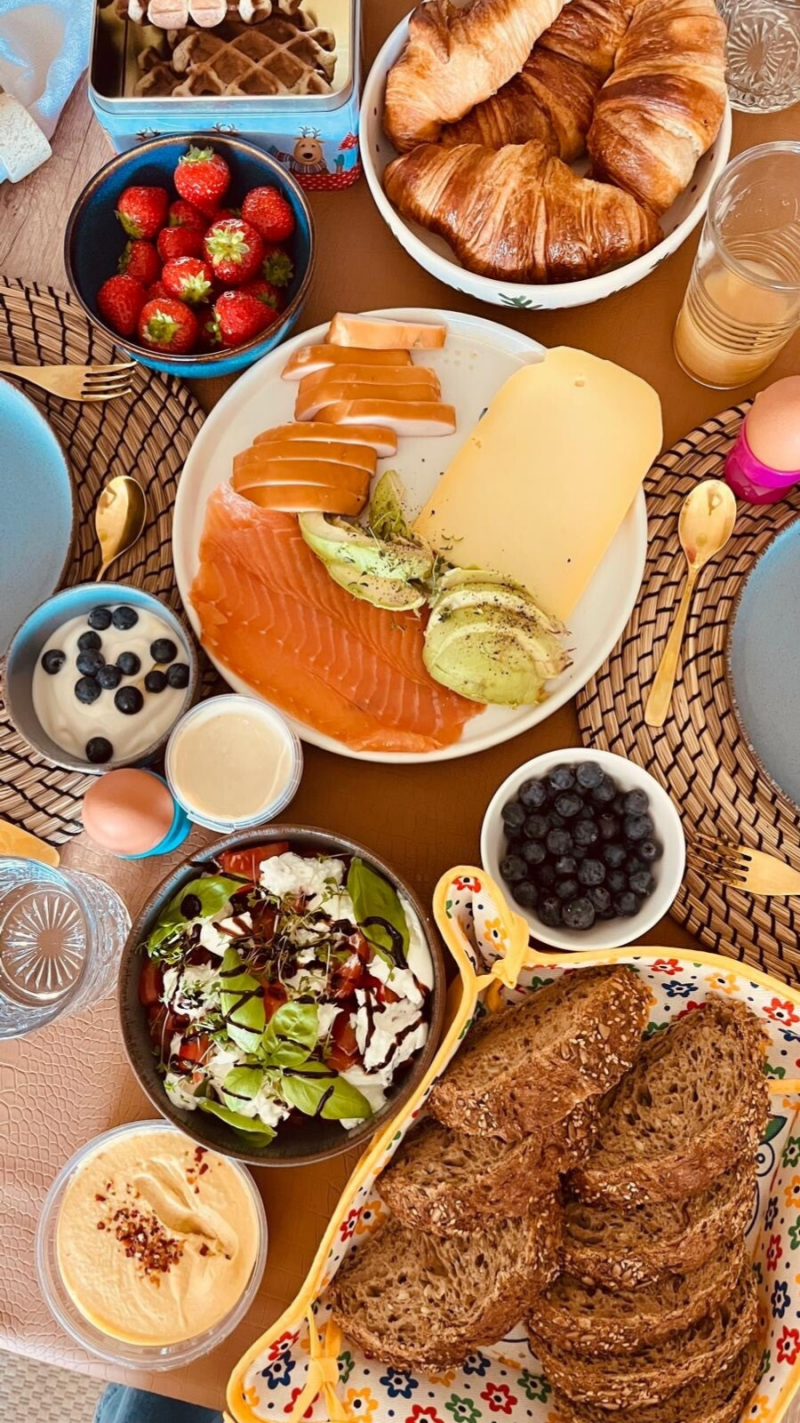 - Beleg: confituur, gerookte zalm, gerookte kip, tuinkers, kaas, hummus, avocado, gekookte eitjes