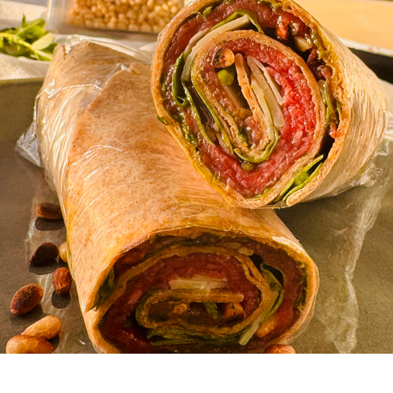 Een heerlijke twist aan de traditionele carpaccio, perfect voor een snelle lunch of een picknick. Dit gerecht wordt geserveerd in een wrap, waardoor het makkelijk mee te nemen is.